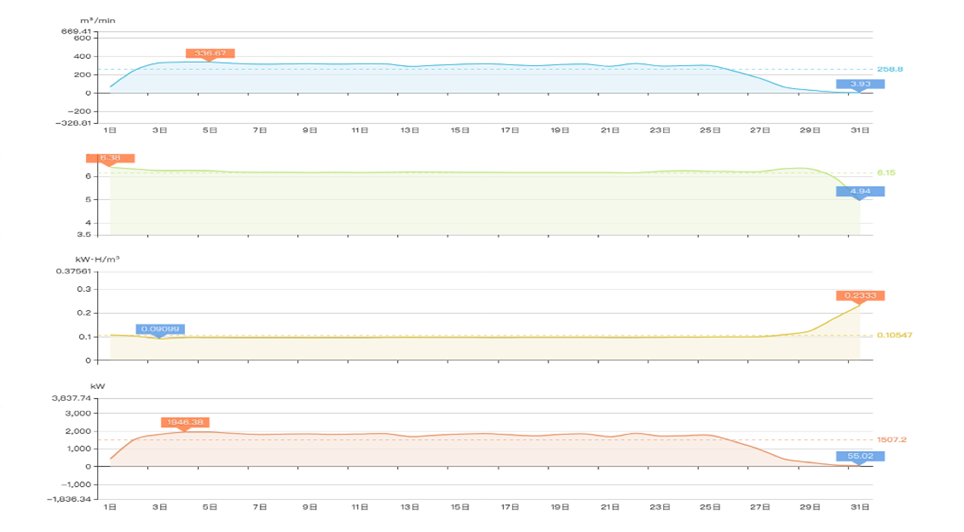 基于高速、有效的數(shù)據(jù)采集,云端實(shí)時(shí)的存儲(chǔ),科學(xué)合理的計(jì)算,以每分鐘的實(shí)時(shí)單耗來(lái)對(duì)標(biāo)整站的運(yùn)行能效,保證壓縮空氣系統(tǒng)始終處于高效運(yùn)行狀態(tài)。